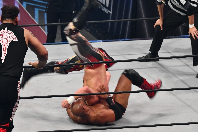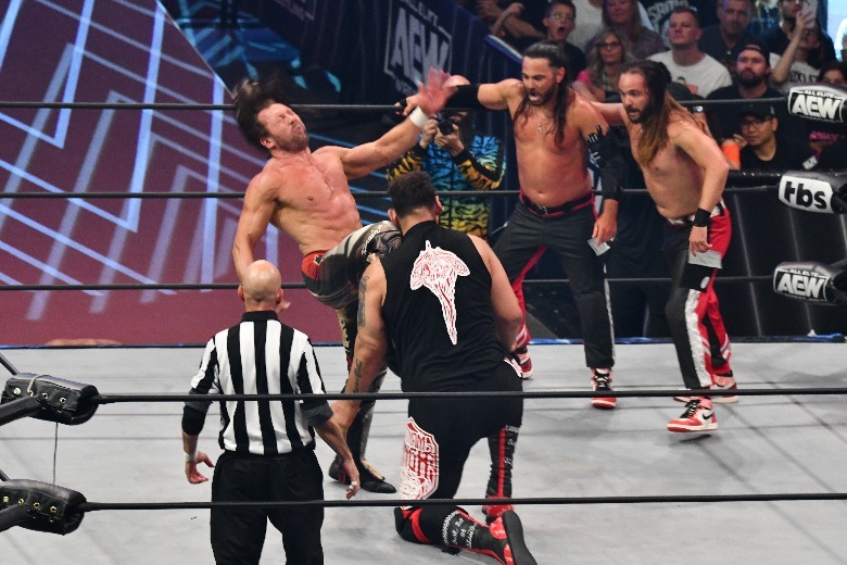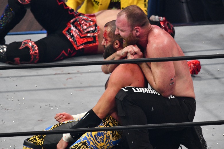 Up next, it was trios time, with Kenny Omega and the Young Bucks taking on Jeff Jarrett, Jay Lethal, Satnam Singh. The match was a back-and-forth affair, with each side gaining the advantage and seemingly no one wanting to take on Singh one-on-one. But who needs to go it alone in a tag team match anyway? The Bucks were able to cut the big man down to size, but of course Karen Jarrett and Sonjay Dutt got involved. The Hardys came out to attack Dutt and even things up a bit, as did "Hangman" Adam Page, allowing Omega to hit the One-Winged Angel on Lethal to secure the win via pinfall.